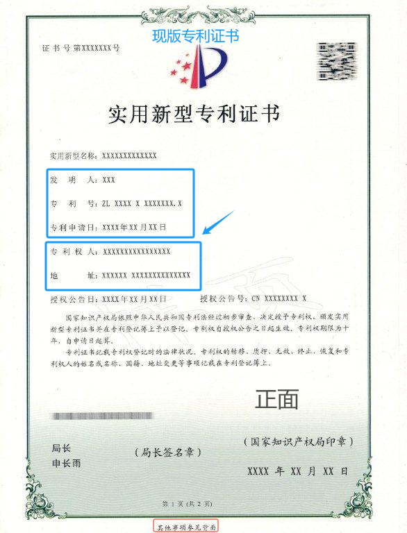 此外,實用新型專利證書和外觀設計專利證書也有相同變化。