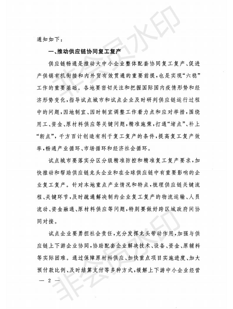 通知要求,試點城市要落實分區(qū)分級精準(zhǔn)防控和精準(zhǔn)復(fù)工復(fù)產(chǎn)要求,加快推動和幫助供應(yīng)鏈龍頭企業(yè)和在全球供應(yīng)鏈中有重要影響的企業(yè)復(fù)工復(fù)產(chǎn);試點企業(yè)要勇?lián)鐣?zé)任,充分發(fā)揮龍頭帶動作用,加強與供應(yīng)鏈上下游企業(yè)協(xié)同,協(xié)助配套企業(yè)解決技術(shù)、設(shè)備、資金、原輔料等實際困難。