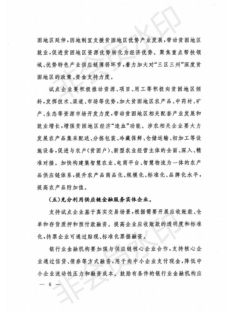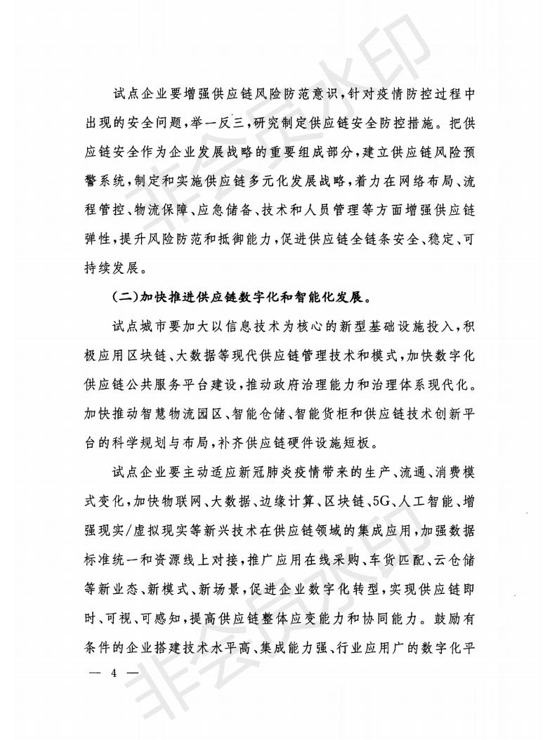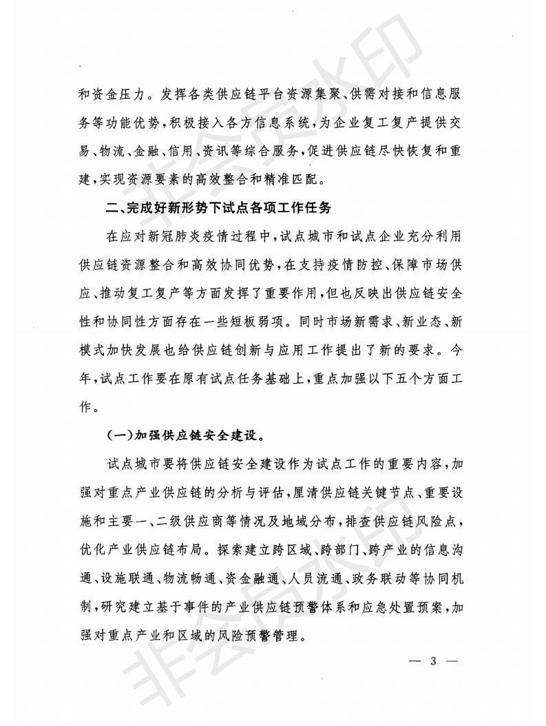 通知指出,為認(rèn)真貫徹落實打贏脫貧攻堅戰(zhàn)、全面建成小康社會重大戰(zhàn)略部署和堅持在常態(tài)化疫情防控中加快推進(jìn)生產(chǎn)生活秩序全面恢復(fù)相關(guān)要求,針對供應(yīng)鏈安全性和協(xié)同性方面存在的短板弱項,積極應(yīng)對市場新需求、新業(yè)態(tài)、新模式加快發(fā)展給供應(yīng)鏈創(chuàng)新與應(yīng)用工作提出的新要求,要在原有試點任務(wù)基礎(chǔ)上,重點做好加強供應(yīng)鏈安全建設(shè)、加快推進(jìn)供應(yīng)鏈數(shù)字化和智能化發(fā)展、促進(jìn)穩(wěn)定全球供應(yīng)鏈、助力決戰(zhàn)決勝脫貧攻堅和充分利用供應(yīng)鏈金融服務(wù)實體企業(yè)等五個方面工作。
