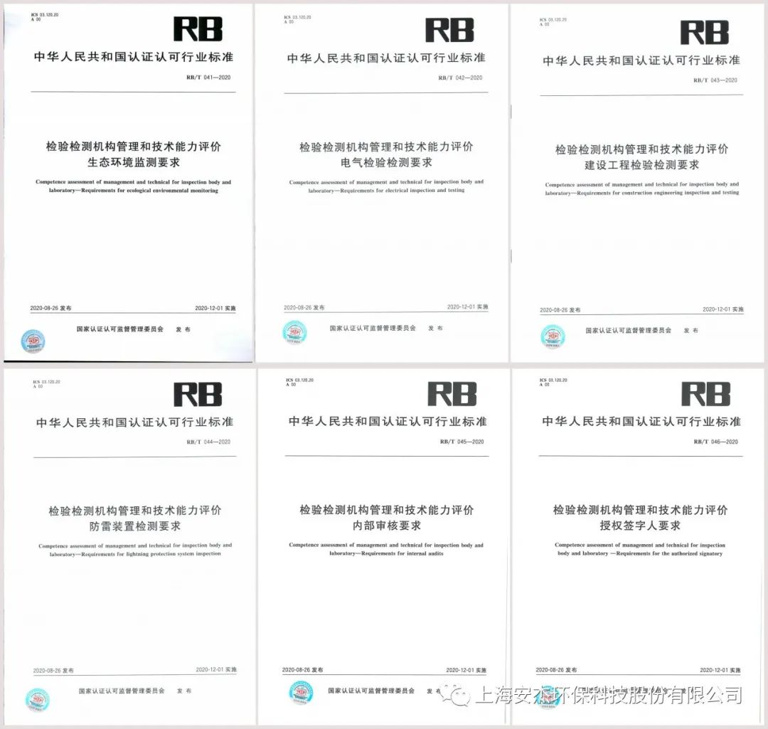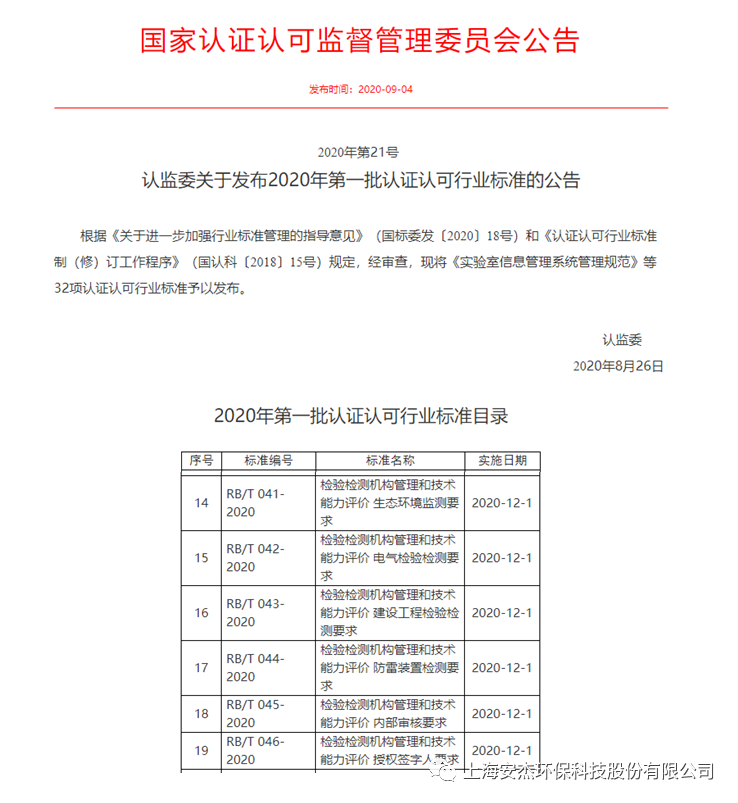 2020年9月4日,國(guó)家認(rèn)證認(rèn)可監(jiān)督管理委員會(huì)發(fā)布《2020年第21號(hào) 認(rèn)監(jiān)委關(guān)于發(fā)布2020年第一批認(rèn)證認(rèn)可行業(yè)標(biāo)準(zhǔn)的公告》,《RB/T 041-2020 檢驗(yàn)檢測(cè)機(jī)構(gòu)管理和技術(shù)能力評(píng)價(jià) 生態(tài)環(huán)境監(jiān)測(cè)要求》、《RB/T 042-2020 檢驗(yàn)檢測(cè)機(jī)構(gòu)管理和技術(shù)能力評(píng)價(jià) 電氣檢驗(yàn)檢測(cè)要求》、《RB/T 043-2020 檢驗(yàn)檢測(cè)機(jī)構(gòu)管理和技術(shù)能力評(píng)價(jià) 建設(shè)工程檢驗(yàn)檢測(cè)要求》、《RB/T 044-2020 檢驗(yàn)檢測(cè)機(jī)構(gòu)管理和技術(shù)能力評(píng)價(jià) 防雷裝置檢測(cè)要求》、《RB/T 045-2020 檢驗(yàn)檢測(cè)機(jī)構(gòu)管理和技術(shù)能力評(píng)價(jià) 內(nèi)部審核要求》、《RB/T 046-2020 檢驗(yàn)檢測(cè)機(jī)構(gòu)管理和技術(shù)能力評(píng)價(jià) 授權(quán)簽字人要求》獲得批準(zhǔn)發(fā)布。