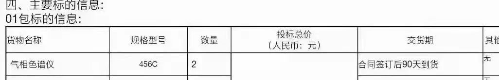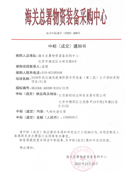 近日,海關(guān)總署物資裝備采購(gòu)中心發(fā)布項(xiàng)目中標(biāo)結(jié)果,此次招標(biāo)為2020年武漢海關(guān)疫情防控專(zhuān)用設(shè)備(第二批)公開(kāi)招標(biāo)采購(gòu)項(xiàng)目,招標(biāo)文件編號(hào)HG20GK-A0000-D164,招標(biāo)采購(gòu)共3包,涉及氣相色譜儀、便攜式核酸檢測(cè)箱、熒光定量PCR儀等相關(guān)設(shè)備,天美公司2臺(tái)賽里安456C氣相色譜儀成功入選。