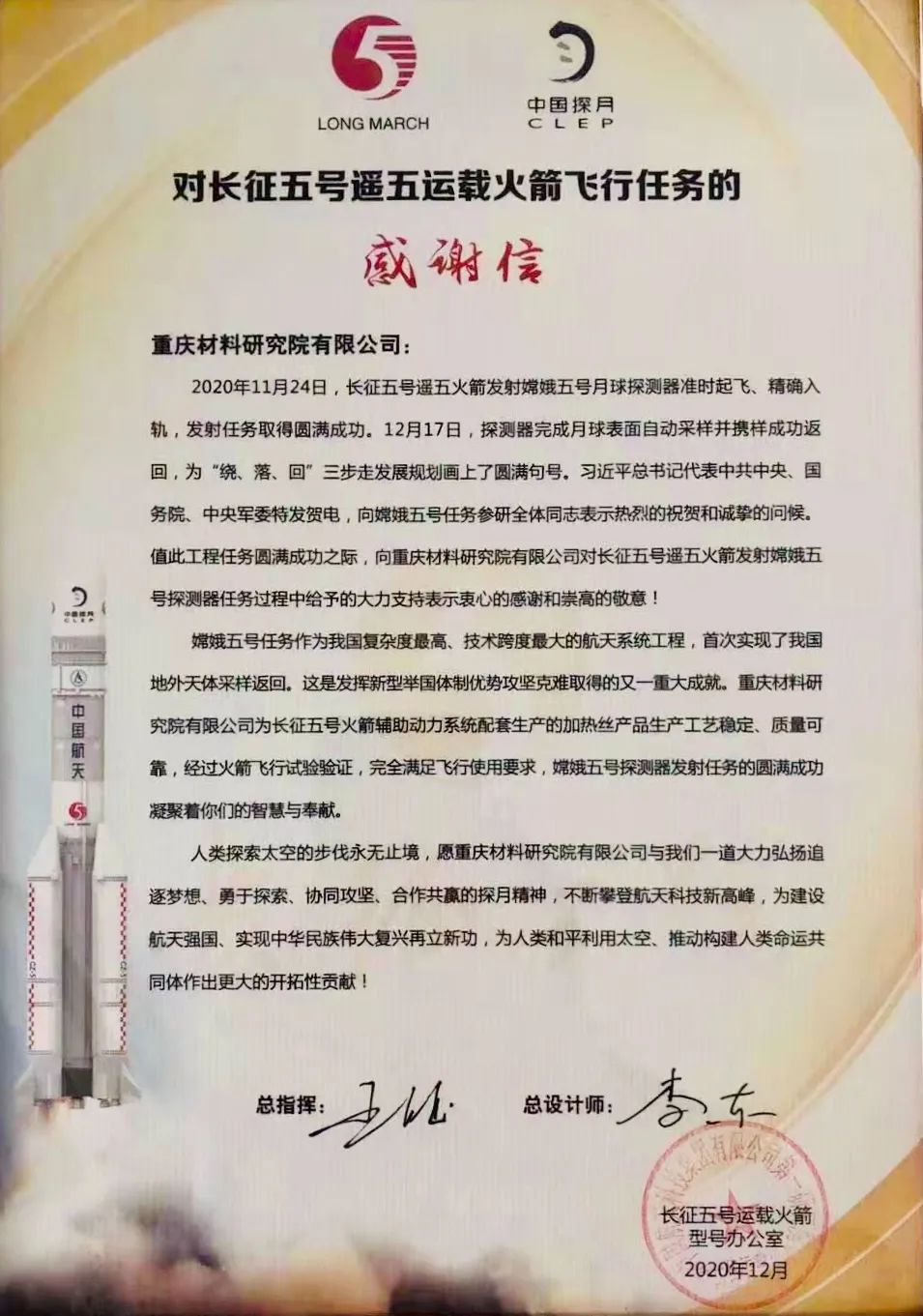 近日,重慶材料研究院有限公司(下簡稱“重材院”)收到了一封特別的感謝信,來自我國長征五號運載火箭型號辦公室。信中提到:“重材院加熱絲產品生產工藝穩定、質量可靠,經過火箭飛行實驗驗證,完全滿足飛行使用要求。”