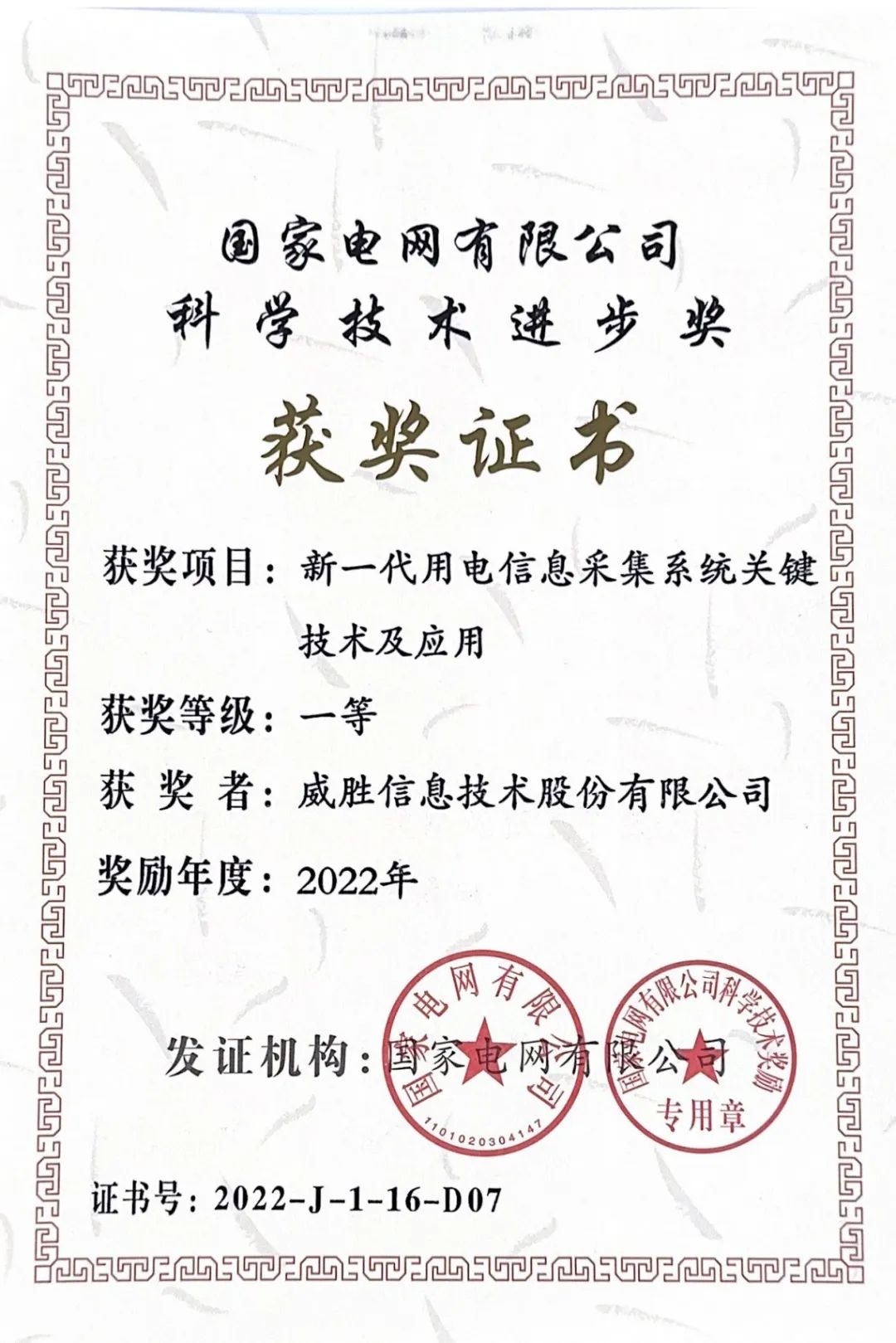 近日,威勝信息參與的“新一代用電信息采集系統(tǒng)關(guān)鍵技術(shù)及應(yīng)用”項(xiàng)目獲得國家電網(wǎng)有限公司2022年度科學(xué)技術(shù)進(jìn)步一等獎(jiǎng)。
