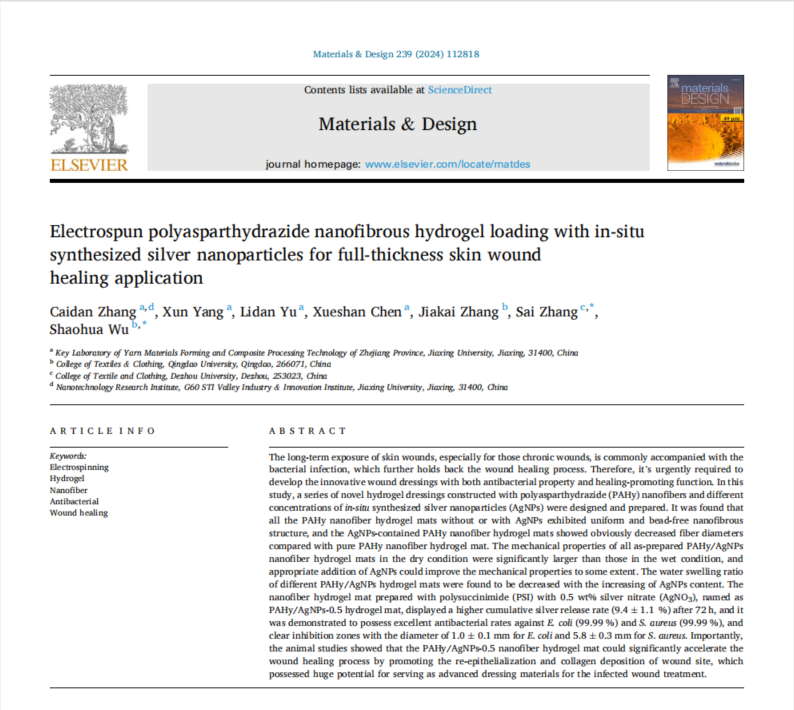 近日,嘉興大學張彩丹與德州學院張賽、青島大學吳韶華合作,在期刊《Materials and Design》(IF=8.4)上發表了題為《原位合成納米銀/聚天冬酰肼納米纖維水凝膠敷料在全皮層缺損傷口愈合中的應用》的最新研究成果。
