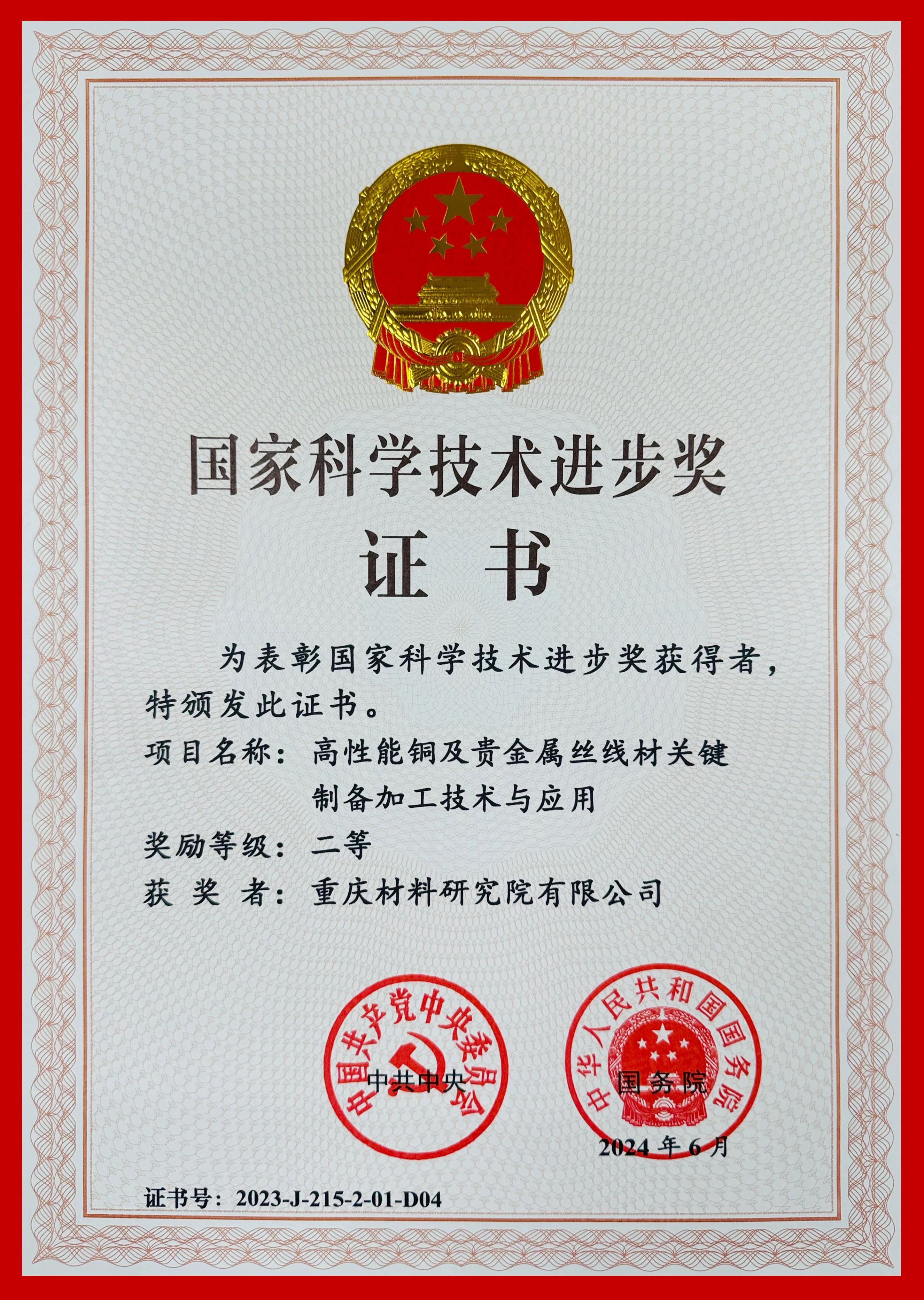 6月24日,全國科技大會、國家科學技術獎勵大會和中國科學院第二十一次院士大會、中國工程院第十七次院士大會在北京隆重召開,2023年度國家科學技術獎揭曉。重慶材料研究院有限公司作為主要參加單位完成的“高性能銅及貴金屬絲線材關鍵制備加工技術與應用”項目榮獲2023年度國家科學技術進步獎二等獎。重材院黨委委員、副總經理(主持經理層工作)吳保安作為獲獎者參加本次活動。