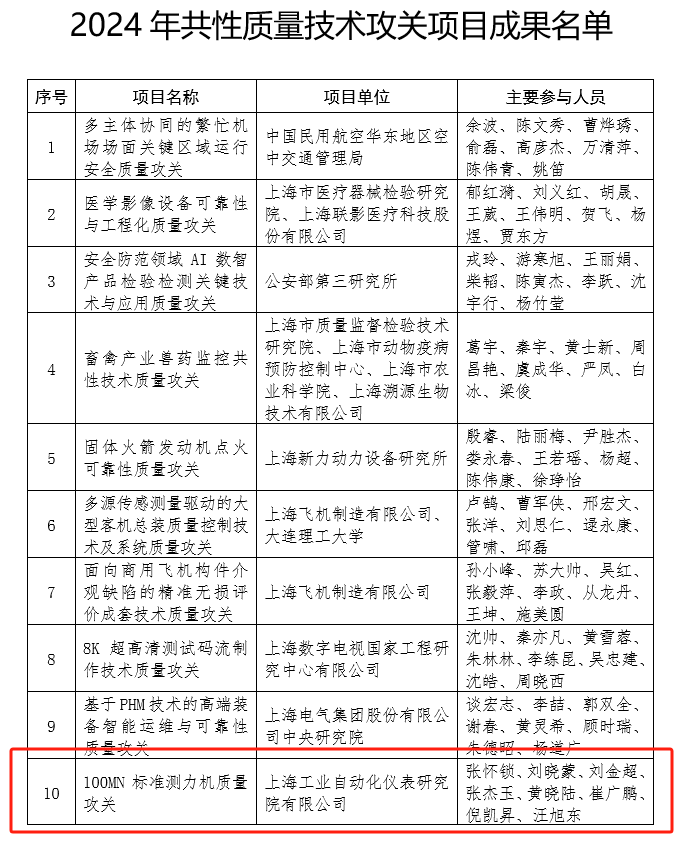 117日,上海市市場監督管理局、上海市經濟和信息化委員會發布《關于表揚2024 年上海市產業質量攻關成果的通知》。上海工業自動化儀表研究院有限公司(簡稱自儀院)“100MN標準測力機質量攻關項目脫穎而出,獲得2024共性質量技術攻關項目成果獎。
