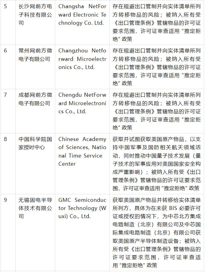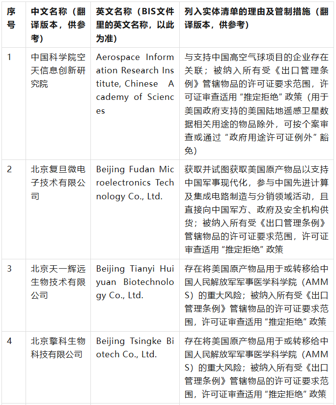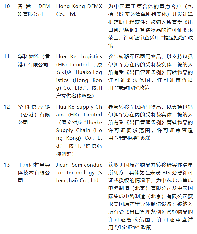 美國商務部工業與安全局(BIS)于9月12日在美國聯邦公報發布公告,通過修訂《出口管理條例》(EAR),將 32 家實體新增至實體清單,其中有23家是中國公司,具體清單、列入實體清單的理由及管制措施如下表(表中提及的列入實體清單的理由為BIS方面指認,不代表本號對該理由或相關事實的認可):