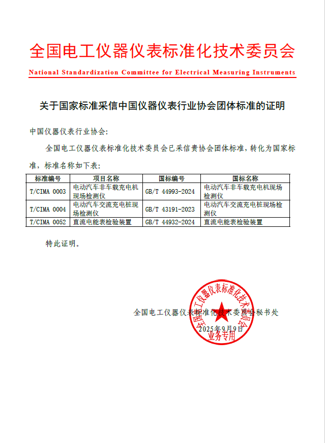 9月,全國電工儀器儀表標準化技術委員會給協會發(fā)來證明文件,協會的3項團體標準已被國標委采信,正式轉化為國家標準。
