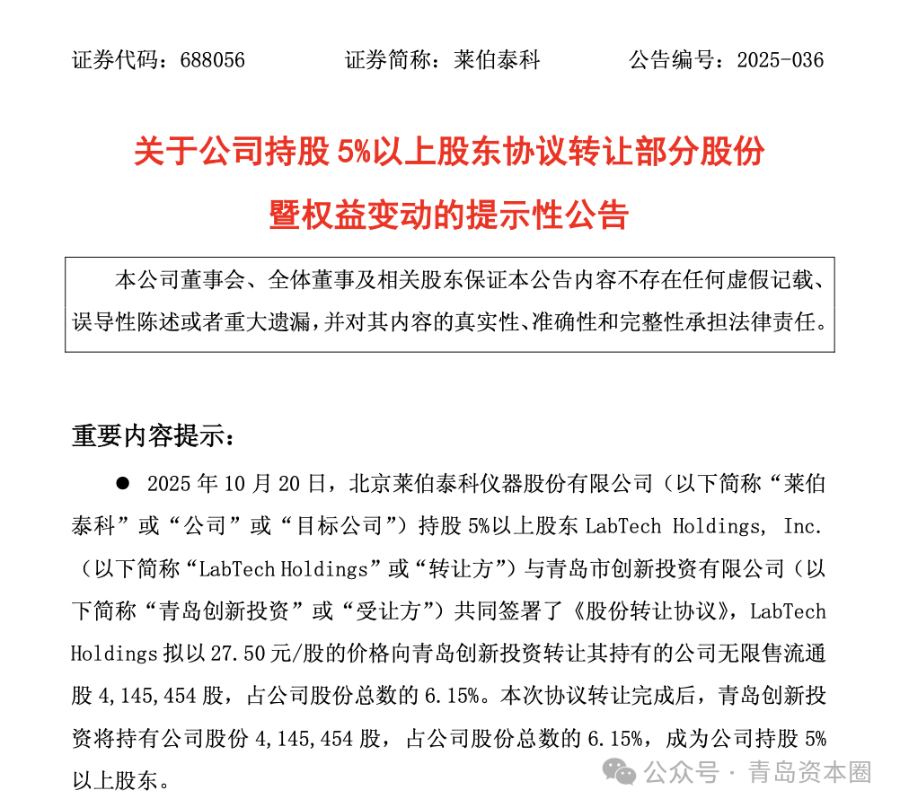 10月21日,北京萊伯泰科儀器股份有限公司(股票代碼:688056,簡(jiǎn)稱(chēng) “萊伯泰科”)發(fā)布公告稱(chēng),公司股東LabTech Holdings, Inc.(以下簡(jiǎn)稱(chēng) “LabTech Holdings” )與青島市創(chuàng)新投資有限公司共同簽署了《股份轉(zhuǎn)讓協(xié)議》,LabTech Holdings擬以27.50元/股的價(jià)格向青島創(chuàng)新投資轉(zhuǎn)讓其持有的公司無(wú)限售流通股414.55萬(wàn)股,占公司股份總數(shù)的 6.15%。本次協(xié)議轉(zhuǎn)讓完成后,青島創(chuàng)新投資將持有公司股份414.55萬(wàn)股,占公司股份總數(shù)的6.15%,成為公司持股5%以上股東。