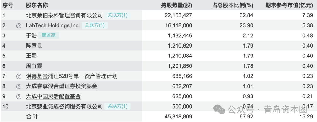 截至 2025 年半年度報(bào)告期末,萊伯泰科股東總數(shù)為3635戶。從主要股東來(lái)看,北京萊伯泰科管理咨詢(xún)有限公司為公司控股股東,持股數(shù)量 2215.34 萬(wàn)股,持股比例 32.84%;LabTech Holdings, Inc. 為第二大股東,持股 1611.80 萬(wàn)股,持股比例 23.90%;此外,于浩、陳宣昆、王墨等自然人股東及諾德基金、大成基金等機(jī)構(gòu)股東也持有一定比例股份。青島市創(chuàng)新投資有限公司本次戰(zhàn)略入股后,將成為公司第三大股東。