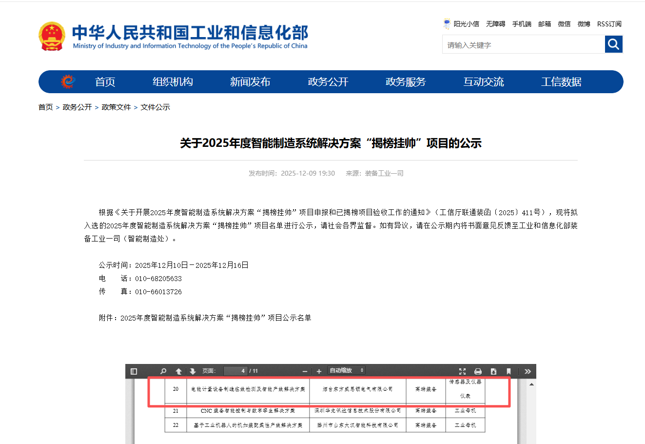 近日,工業和信息化部公示了2025年度智能制造系統解決方案“揭榜掛帥”項目名單,威思頓“電能計量設備制造在線檢測及智能產線解決方案”項目成功入選。