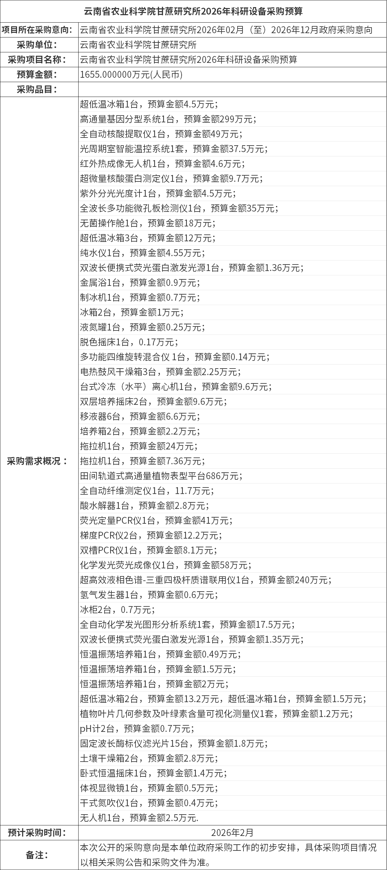 云南省農業科學院甘蔗研究所2026年年科研設備采購預算情況發布,采購51臺套儀器設備,預算金額1655萬元。