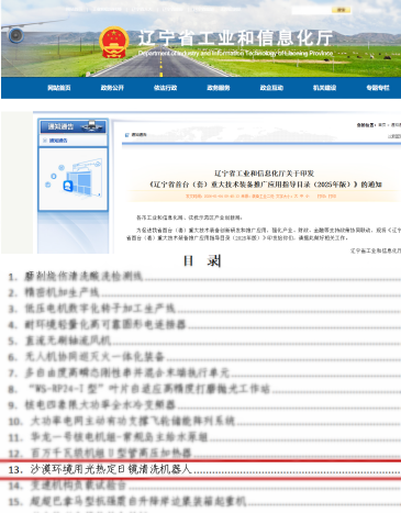 新年伊始,遼寧省工業和信息化廳正式印發《遼寧省首臺(套)重大技術裝備推廣應用指導目錄(2025年版)》。我院申報的《沙漠環境用光熱定日鏡清洗機器人》 項目經過嚴格評審,成功獲得“首臺(套)”重大技術裝備認定,并被納入省級推廣應用名錄。這是我院在高端裝備研發與產業化應用領域取得的又一重要突破!