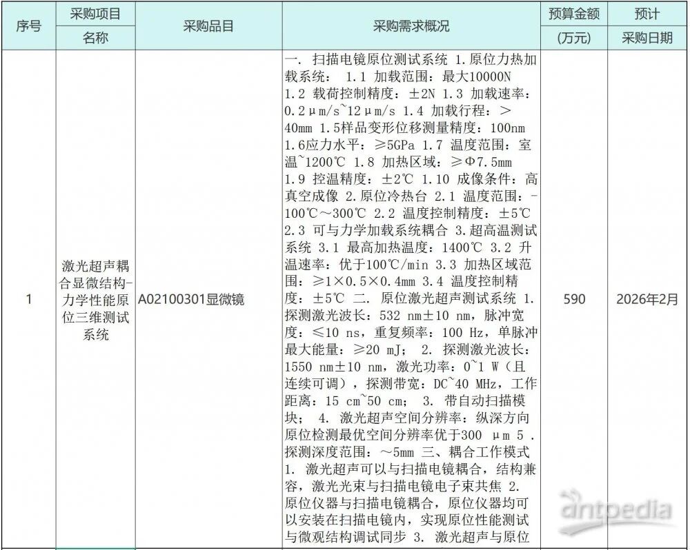 本次采購的“激光超聲耦合顯微結構-力學性能原位三維測試系統”技術集成度高、指標先進。該系統要求能夠與掃描電鏡深度耦合,在微觀尺度下(如掃描電鏡腔內)實現對材料在極端條件(如-100℃至1400℃溫度范圍、高達5GPa的應力水平)下的力學行為進行實時、原位觀測,并同步結合激光超聲技術進行亞表面缺陷與性能的無損檢測與三維成像。該系統的引入,將為新材料研發、微觀力學機制研究等前沿領域提供前所未有的“洞察力”。