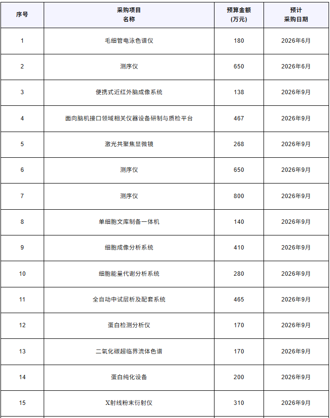 近日,南京醫科大學發布20262(2)政府采購意向公告,計劃采購毛細管電泳色譜儀、測序儀、便攜式近紅外腦成像系統、激光共聚焦顯微鏡、蛋白檢測分析儀、X射線粉末衍射儀等儀器設備,總預算9364萬元,預計采購時間20266~9月。