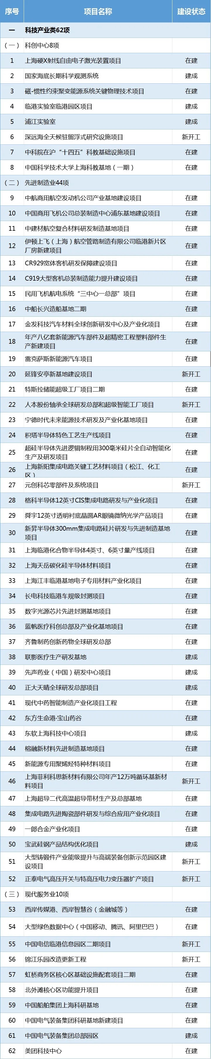 在建項目44項:上海硬X射線自由電子激光裝置項目、磁-慣性約束聚變能源系統關鍵物理技術項目、中航商用航空發動機公司產業基地建設項目、中國商用飛機公司總裝制造中心浦東基地建設項目、大型綠色數據中心(中國移動、騰訊、阿里巴巴)等。