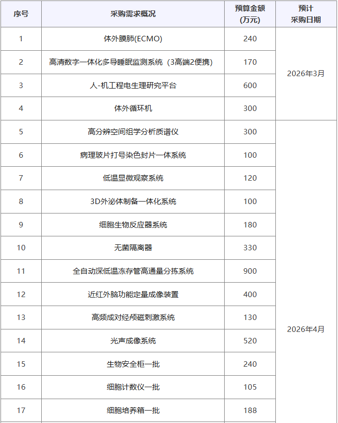 近期,上海臨床研究中心發(fā)布多項(xiàng)儀器采購意向,計(jì)劃采購高分辨空間組學(xué)分析質(zhì)譜儀、低溫顯微觀察系統(tǒng)、細(xì)胞生物反應(yīng)器系統(tǒng)、生物安全柜、細(xì)胞計(jì)數(shù)儀、二氧化碳細(xì)胞培養(yǎng)搖床、倒置熒光顯微鏡、超低溫冰箱等儀器設(shè)備,預(yù)算總金額15513.1萬元。預(yù)計(jì)采購時間2026年3月~5月。